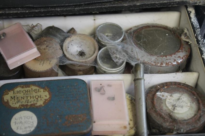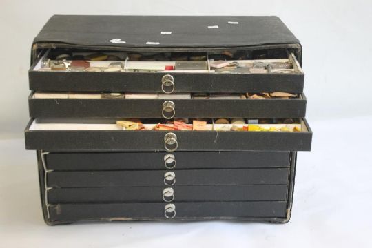 A LARGE QUANTITY OF POCKET WATCH PARTS STORED IN A NINE DRAWER CABINET, to include movements, cases and dials.