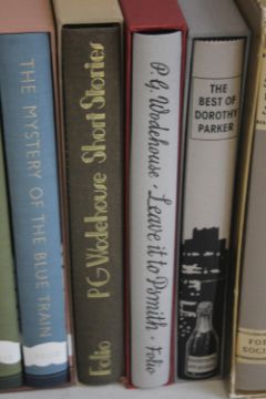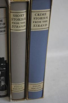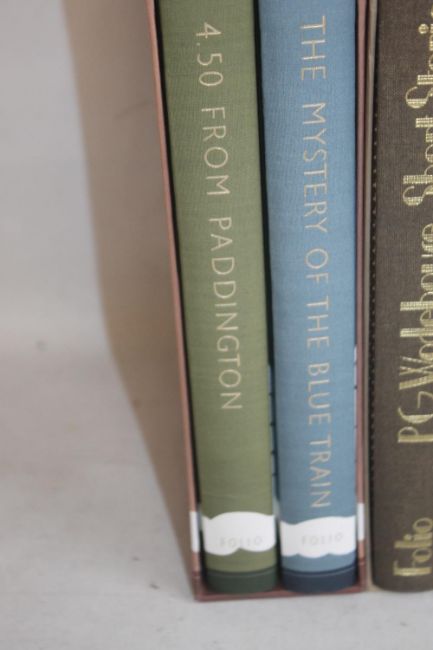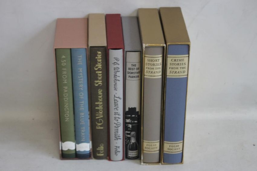 FOLIO SOCIETY - AGATHA CHRISTIE, two volume cased set "4.50 From Paddington" and "The Mystery of the Blue Train" 1990, together with P. G. Wodehouse "Short Stories" 1983 and "Leave It To Psmith" 3rd printing 1992, "The Best of Dorothy Parker" 5th printing 1999, also "Crime Stories From The Strand" and "Short Stories From The Strand" all in slipcases