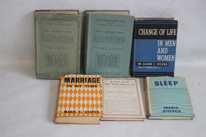 MARIE STOPES - FOUR EARLY EDITIONS WITH DUSTJACKETS to include "Contraception (birth Control) Its Theory, History and Practice", John Bale 1923 (second printing) and 1925 4th printing, "Marriage In My Time" Rich & Cowan, 1935 "Change of Life In Men and Women", Putnam's Sons, New York 1936, "Sleep", Chatto & Windus, 1956, together with "Radiant Motherhood", Putnam & Co. 9th edition, 1948 (6)