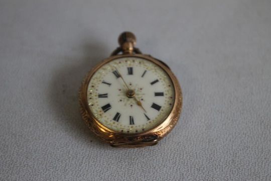 A SMALL CONTINENTAL ENAMELLED YELLOW METAL FOB WATCH, decorated to the back with a lake scene with a swan in the foreground.
