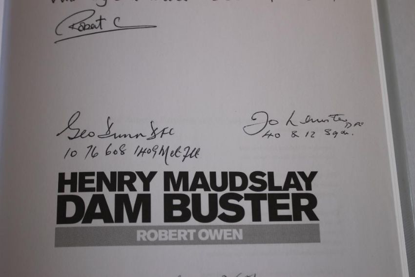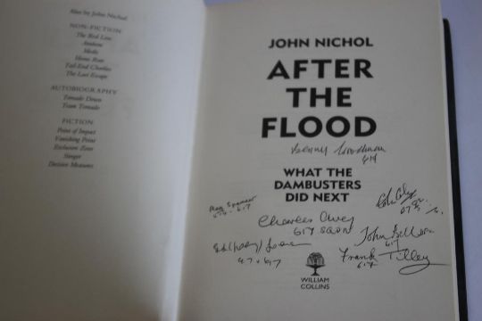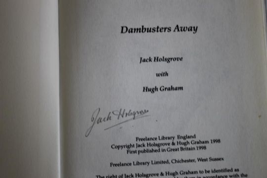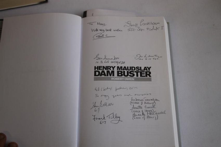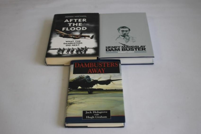SIGNED COPIES OF DAMBUSTERS BOOKS - Jack Holsgrove with Hugh Graham - 'Dambusters Away' 1998 signed by author in pencil on title page, together with Robert Owen - 'Henry Maudslay Dam Buster' 2014 with inscription "To Mary, With very best wishes, Robert O" also signed by Johnny Johnson DFM "So many years and memories", Geoff Packham, George Dunn DFC, John Bell DFC, Frank Tilley, and three nieces of Henry - Victoria Trevelyan, Annette Parrott, and Henrietta MacCurrach, also John Nichol - 'After The Flood What The Dambusters Did Next' 2015 with various signatures including Johnny Johnson, Charles Avey, Benny Goodman, Reg Spencer, Colin Cole, John Bell, Frank Tilley (3)