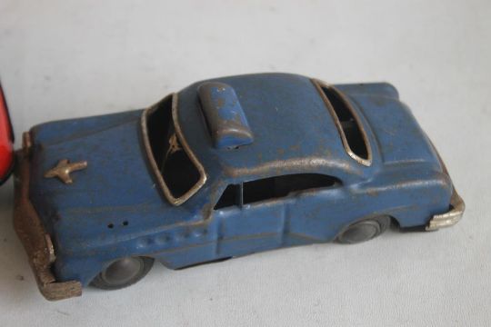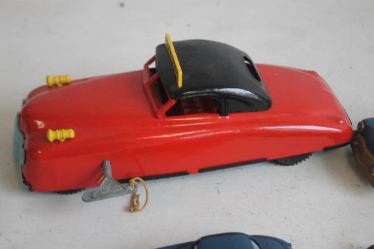 VINTAGE CLOCKWORK CAR WITH TRIANG KEY, together with Chad Valley (?) Police Siren car, 'Empire Made' police car, and a Dinky Toy Ferrari and another (5)