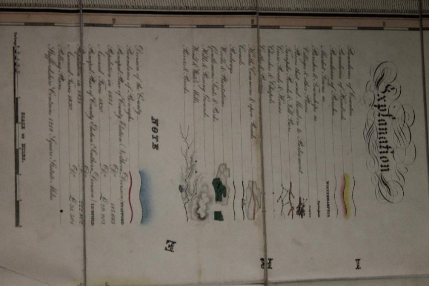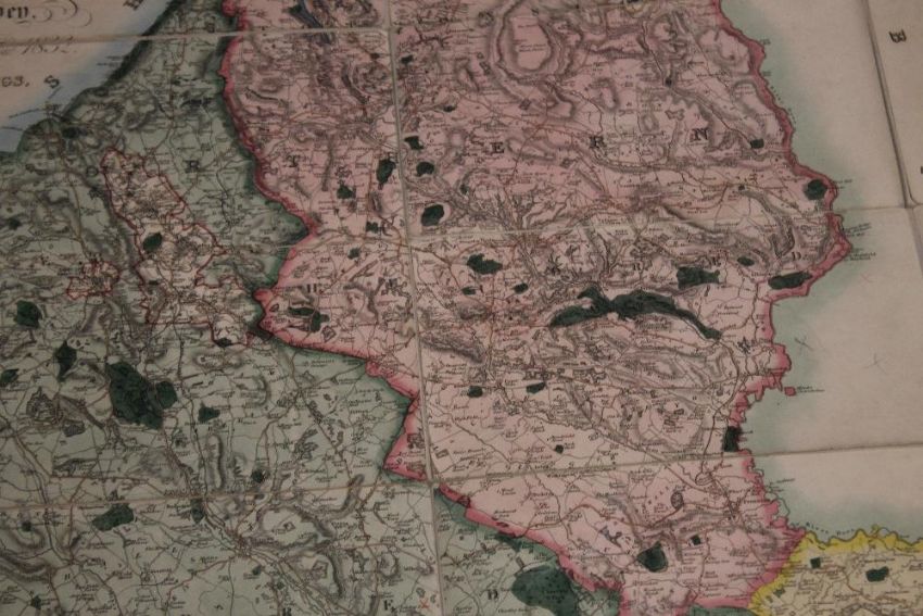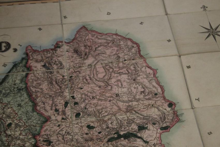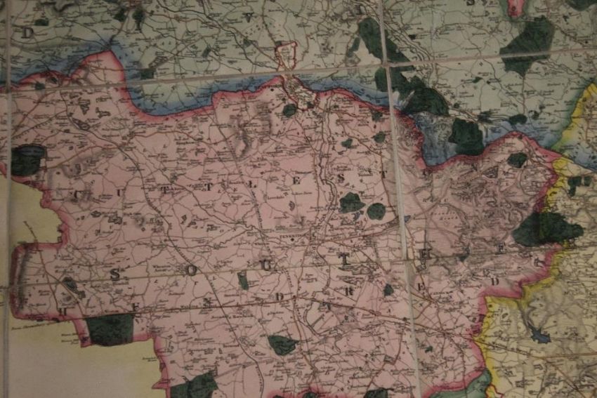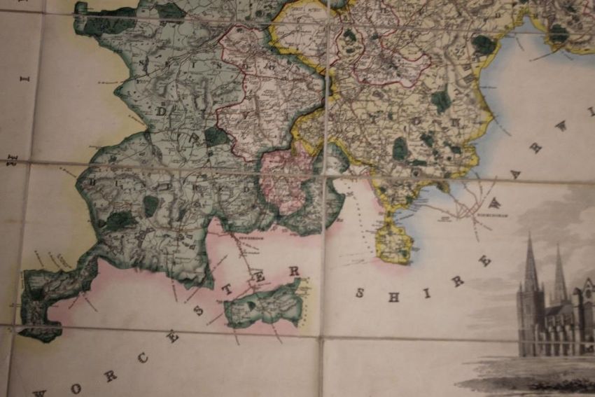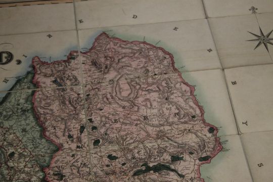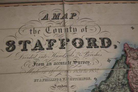 PHILLIPS & HUTCHINGS LARGE SCALE MAP OF STAFFORDSHIRE, published by Teesdale, engraved by J. Dower, c.1832, linen backed sectional map with vignette of Lichfield Cathedral, edged in green silk, contained in a slipcase which looks like an antiquarian book