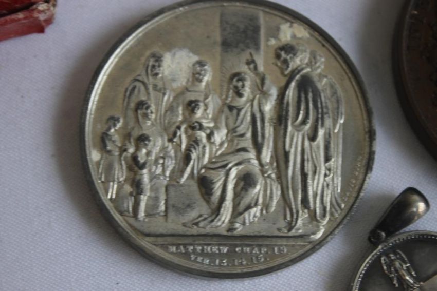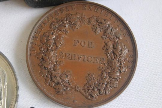 INTERNATIONAL EXHIBITION 1862 BRONZE "FOR SERVICE" MEDAL 55 mm. along with other minor medals to Include St Barnabas Sunday School 1882 Medal and an NUR 30 years service badge.