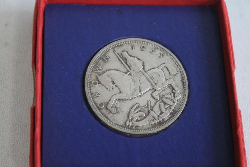 A 1935 CROWN AND A 1953 COIN SET 1/4 d - crown in presentation boxes.