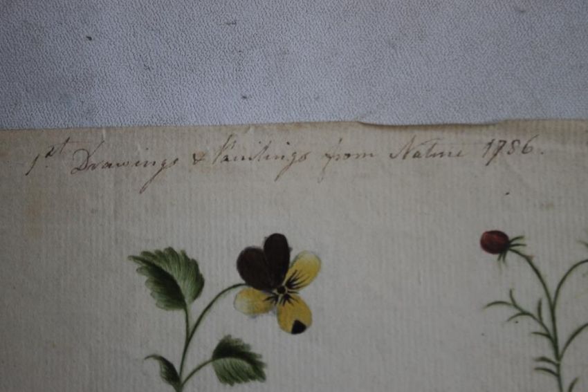 A delightful 18th Century page of watercolour flower studies which says at the top "1st Drawings and Paintings from nature 1786", pencilled at the bottom is Ann Durward? (Ann Durward was James Ferrier Carmichael's mother).