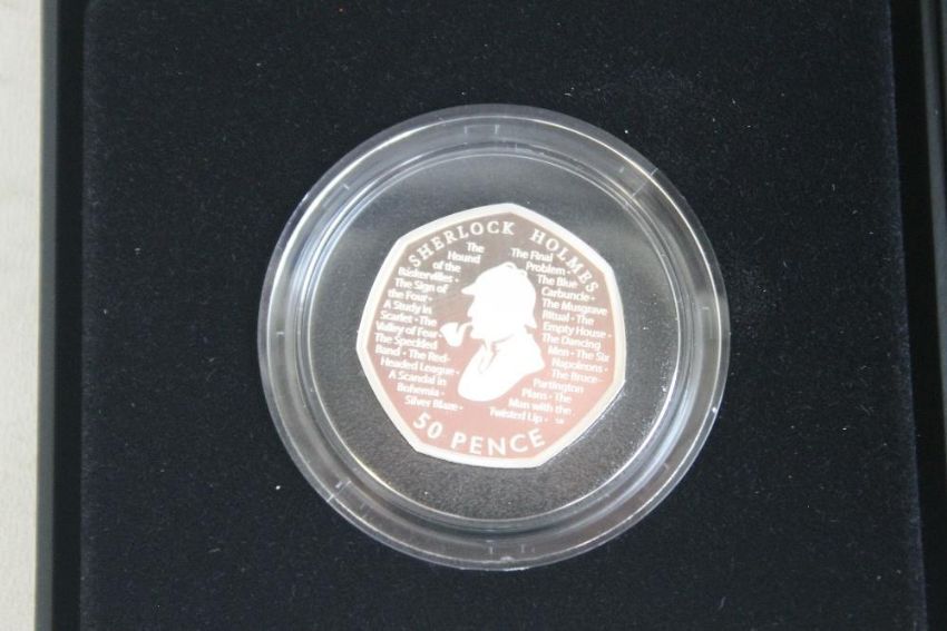 SHERLOCK HOLMES 2019, Piedfort silver proof 50p, a silver proof 50p (Both in cases of issue with COA'S) and a standard 50p in pack (3).