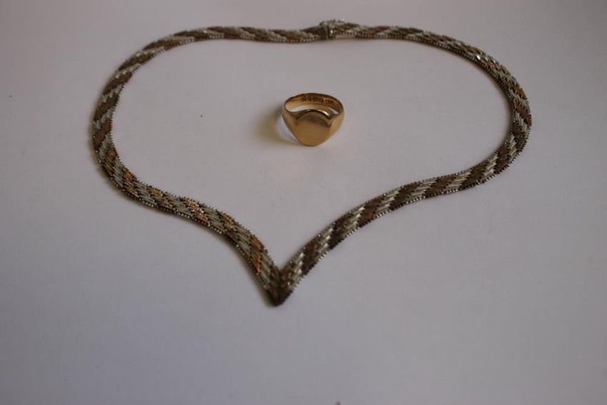 AN 18ct GOLD SIGNET RING, together with a three colour silver wishbone necklace, weight of 18ct gold ring 6g