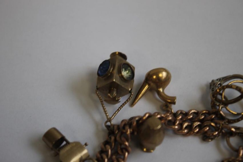 A 9CT GOLD AND YELLOW METAL CHARM BRACELET, charms include a railway lamp, kettle and fish etc.