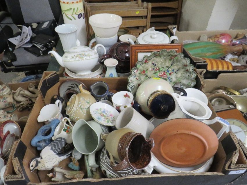 TWO TRAYS OF ASSORTED VINTAGE AND MODERN CERAMICS TO INCLUDE A WEDGWOOD PETERSHAM TEAPOT, SQUIRES WHISKY JUG, FIGURES ETC.