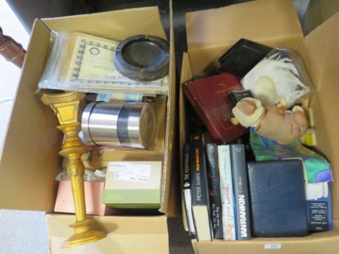 TWO LARGE BOXES OF ASSORTED HOUSEHOLD SUNDRIES TO INCLUDE BOXED SHOES, BOOKS ETC.