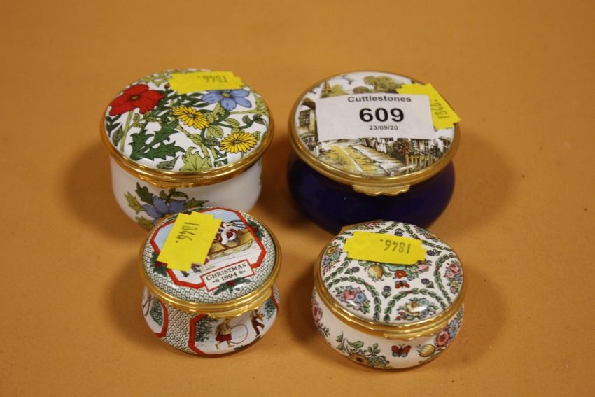 FOUR ENAMEL PILL BOXES TO INCLUDE TWO HALCYON DAYS EXAMPLES