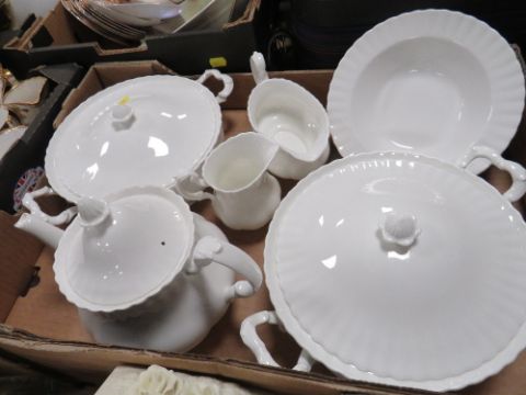 A LARGE COLLECTION OF UNFINISHED, UNMARKED WHITE CHINA IN THE STYLE OF ROYAL ALBERT TO INCLUDE DINING PLATES, TWO TEAPOTS, TUREENS, CUP AND SAUCERS ETC. (3)