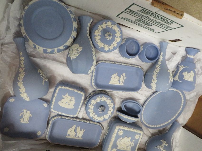 TWO BOXES OF MOSTLY BLUE WEDGWOOD JASPERWARE TO INCLUDE A CABINET PLATE