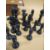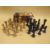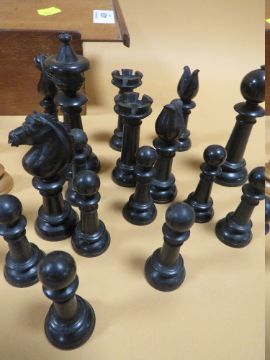 A BOX OF VINTAGE CARVED WOODEN CHESS PIECES IN BOX MARKED CHASSEREAU'S WAREHOUSE