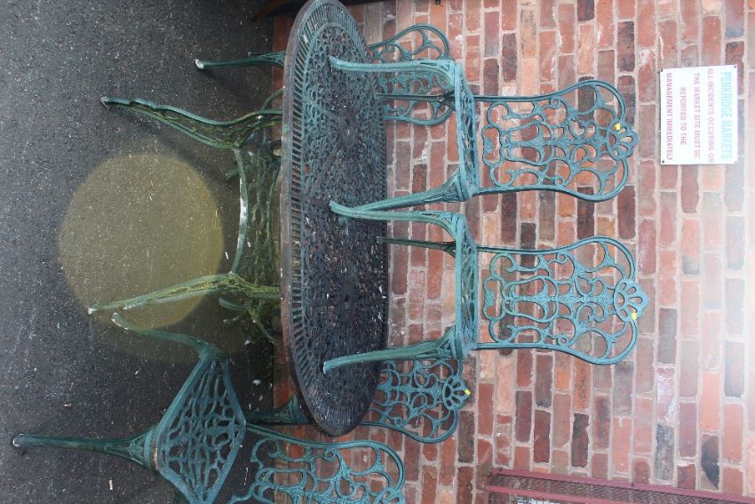 A PAINTED GREEN METAL GARDEN TABLE AND 5 CHAIRS