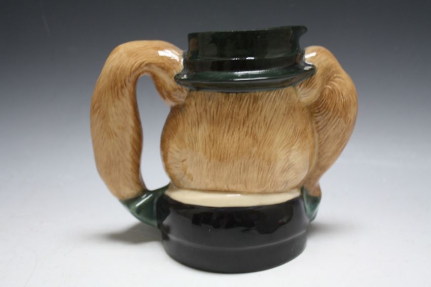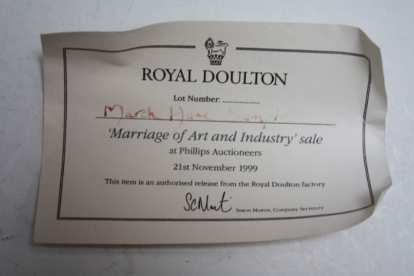 ROYAL DOULTON PROTOTYPE CHARACTER JUG SAMPLE OF THE MARCH HARE, coming with Doulton certificate of sale at Phillips 'Marriage of Art and Industry' sale 21st November 1999 and stamped to base 'The property of Royal Doulton tableware limited, not produced for sale', having green scarf with blue polkadots, H 16 cm