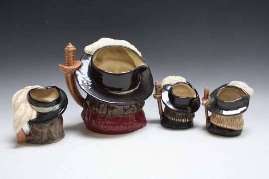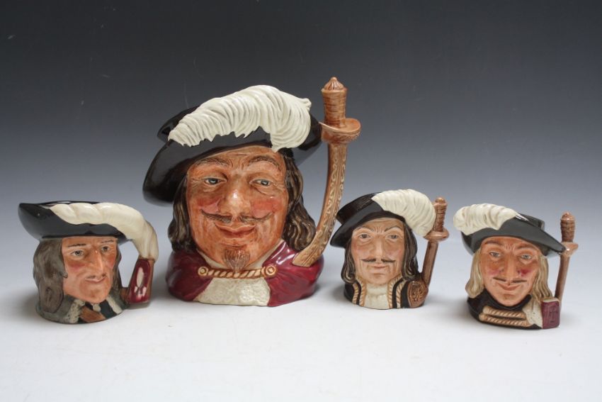 FOUR ROYAL DOULTON MUSKETEER CHARACTER JUGS, consisting of large Porthos D6440, and medium Athos D6452, Aramis D6454 and D'Artagnan D6764