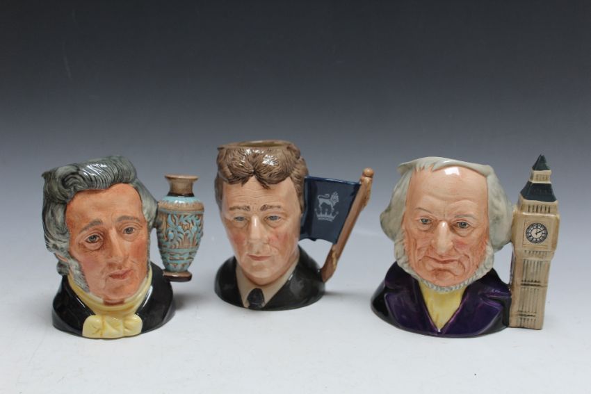 A SIGNED ROYAL DOULTON CHARACTER JUG - MICHAEL DOULTON D6808, together with collectors club edition Sir Henry Doulton D6703 and collectors club edition Henry Doulton d6656, H 11 cm (3)