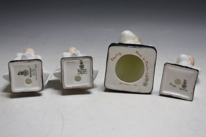 FOUR ROYAL DOULTON FIGURES CONSISTING OF DARLING HN1319, a small version of Darling HN1985 and two small versions of Bedtime HN1978, H 15.5 m