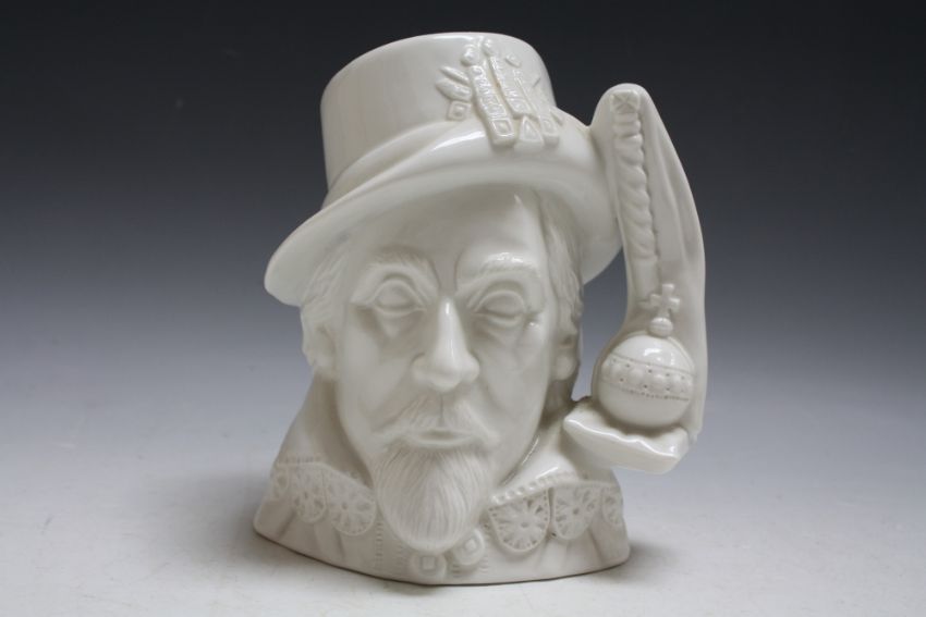 A 'NOT PRODUCED FOR SALE' UNPAINTED ROYAL DOULTON CHARACTER JUG - KING CHARLES I, stamped 'property of Royal Doulton Tableware Ltd NOT PRODUCED FOR SALE to the base, H 19 cm