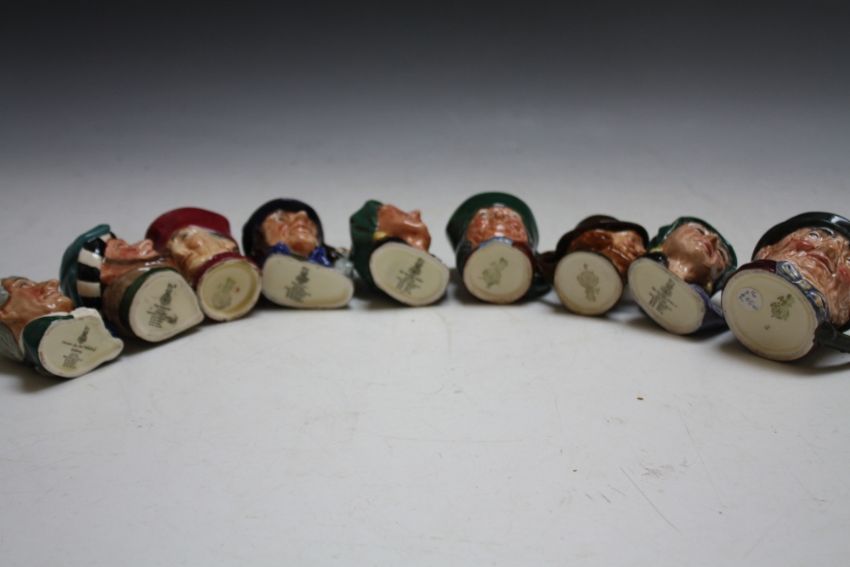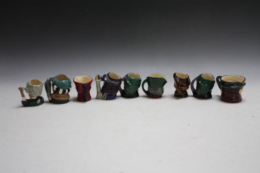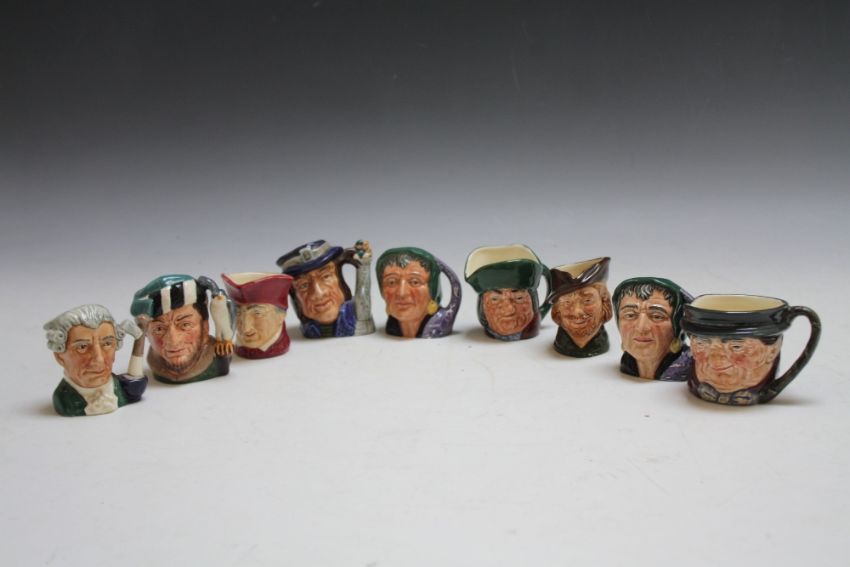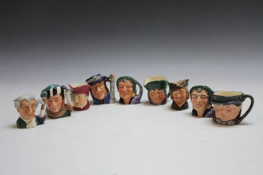 NINE ASSORTED SMALL ROYAL DOULTON CHARACTER JUGS, to include The Falconer, H 7 cm