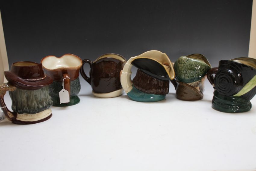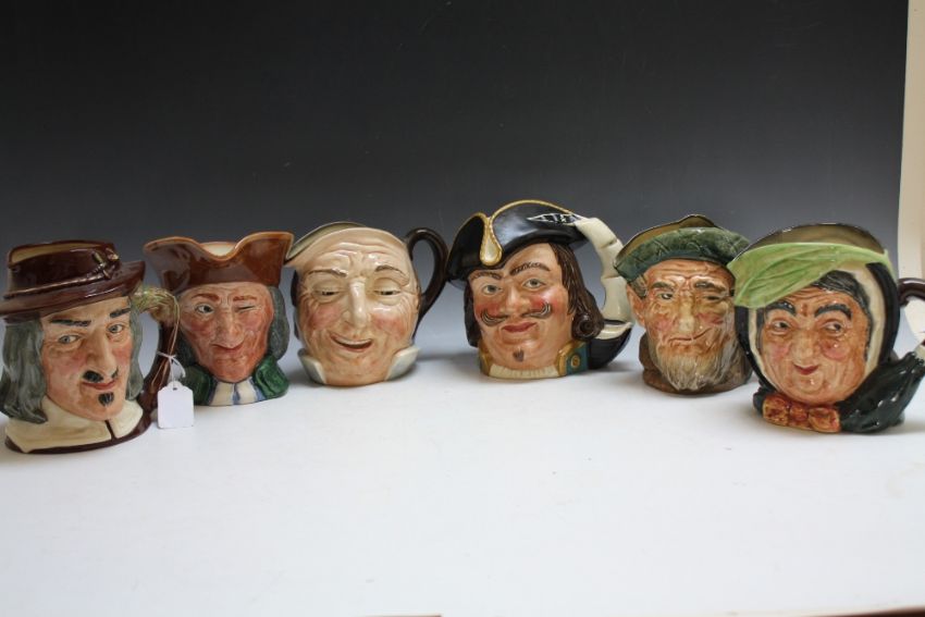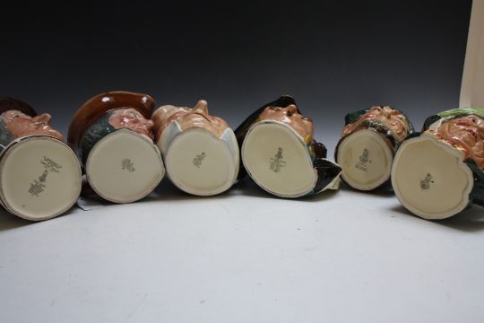 SIX ASSORTED LARGE ROYAL DOULTON CHARACTER JUGS, consisting of Farmer John, Capt Henry Morgan, Owd Mac, Izaak Walton, The Vicar Of Bray and Sairey Gamp, H 17 cm