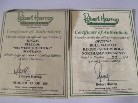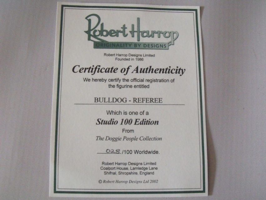 FOUR BOXED ROBERT HARROP SPECIAL LIMITED EDITION DOG FIGURES, comprising three Bulldog rugby themed figures, Bulldog 'The World's Strongest Dog' 56 of 100, together with a Studio 100 Edition Bulldog Referee 028 of 100 (5)