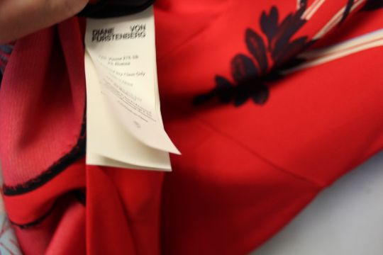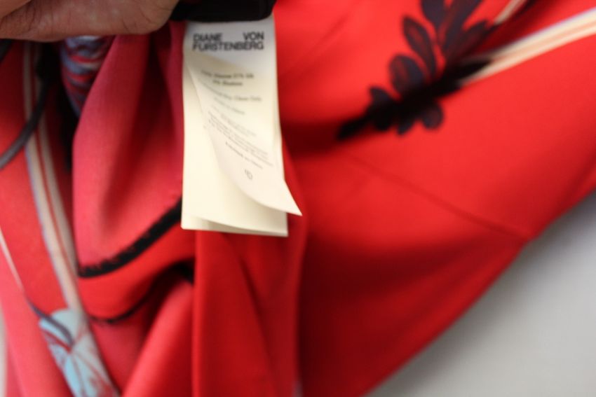 A LADIES RED FLORAL PRINT DRESS, make unknown, size EU 40