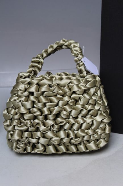 A MIISTA SMALL PLAITED EFFECT SAGE GREEN HANDBAG, single carry handle with press stud fastening