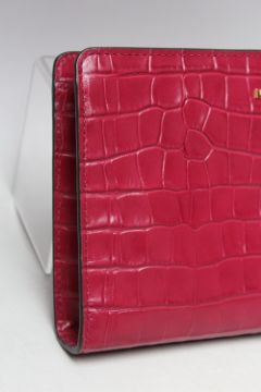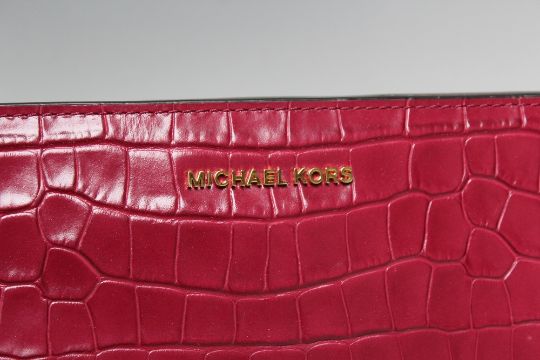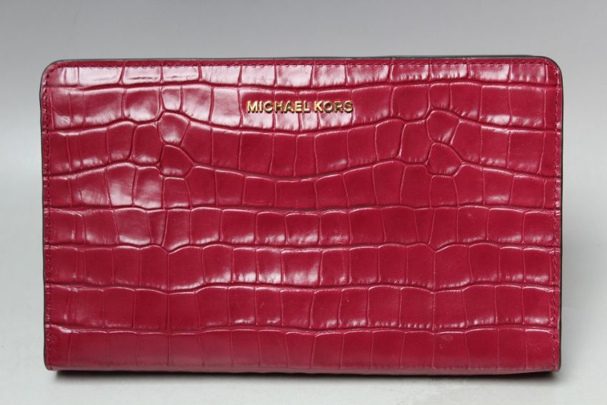A MICHAEL KORS FUSHIA EMBOSSED LEATHER CROSS BODY CLUTCH BAG, single open pocket to reverse of bag with concealed detachable strap loops above, single zippered and multiple open pockets to the interior, bag dimensions W 25 cm, H 15.5 cm, D 4 cm, complete with adjustable cross body strap