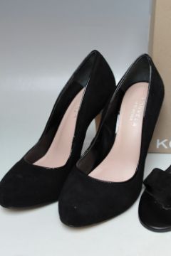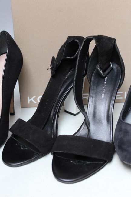 A PAIR OF KURT GEIGER BLACK AND WHITE SUEDE PATENT SANDALS, EU size 39, together with a pair of Carvela Kurt Geiger 'Antibes' black suede court shoes EU size 39, and a pair of Melissa black suede court shoes UK size 7 (3)