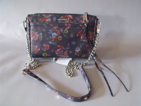 A REBECCA MINKOFF FLORAL / NAVY CROSS BODY BAG, silver tone hardware with chain and studded embellishment, H 17 cm, W 23 cm