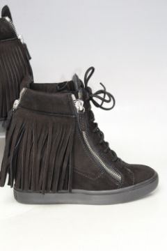A PAIR OF GINA PLATFORM ANKLE BOOTS, black suede finish with twin zips and tassels to each, EU size 39.5