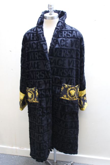 A VERSACE GENTLEMANS BATH ROBE WITH GOLD LETTERING TO THE BACK