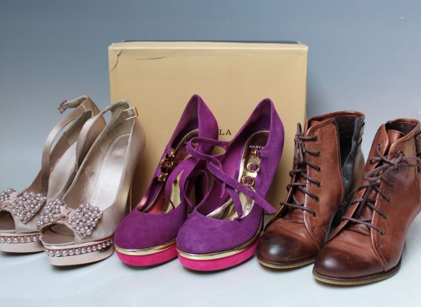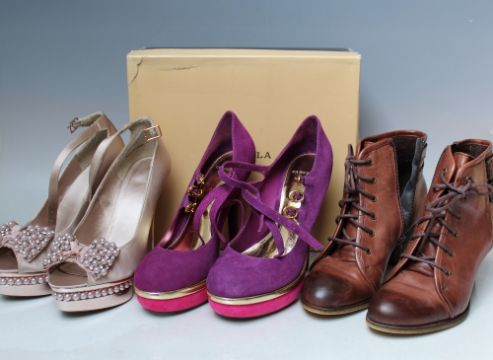 TWO BOXED PAIRS OF CARVELA LADIES SHOES, comprising a pair of 'Assess' purple and pink suede court shoes, EU size 40 and a pair of 'Gracious' nude fabric occasion wear sandals, EU size 39, together with a pair of boxed Carvela 'Spencer' Brown leather boots, EU size 40 (3)