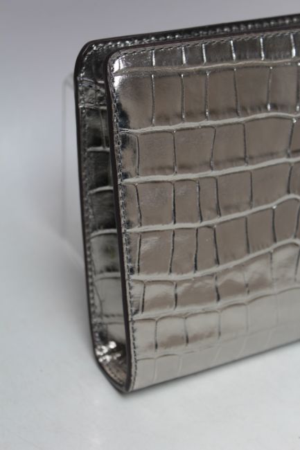 A MICHAEL KORS GUNMETAL EMBOSSED LEATHER CROSS BODY CLUTCH BAG, single open pocket to reverse of bag with concealed detachable strap loops above, single zippered and multiple open pockets to the interior, bag dimensions W 25 cm, H 15.5 cm, D 4 cm, complete with adjustable cross body strap