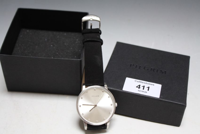 A PILGRIM WRIST WATCH AND BOX, DIA 4.5 CM