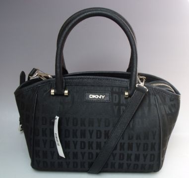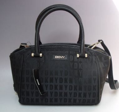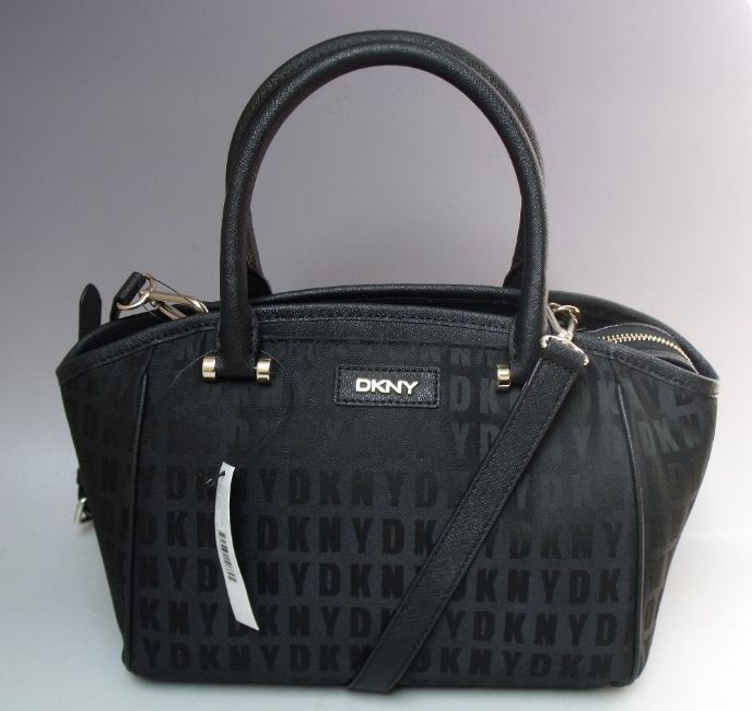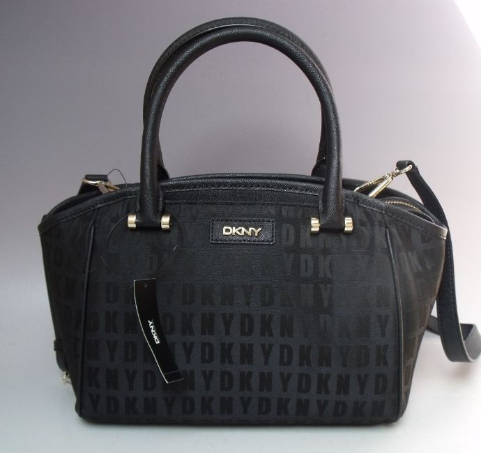 A DKNY BLACK FABRIC REPEAT LOGO DESIGN HANDBAG, gold-tone hardware, detachable shoulder strap, W 27 cm, H 27 cm, D 15 cm