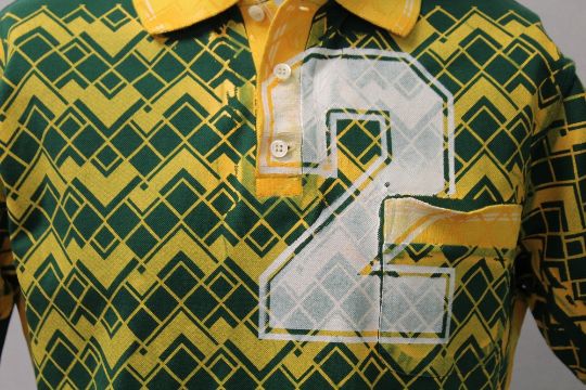 COMME DES GARCONS, a gents polo shirt, green and yellow with No 2 to front, size X