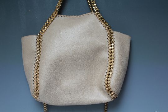 A STELLA MCCARTNEY CALFSKIN BUCKET STYLE HANDBAG, chain link handles with additional shoulder chain, with gold-tone detailing, magnetic fastening with detachable accessories pouch, dust bag, H 23 cm, W 34 cm