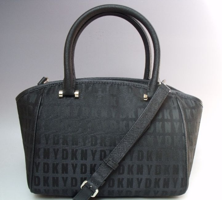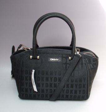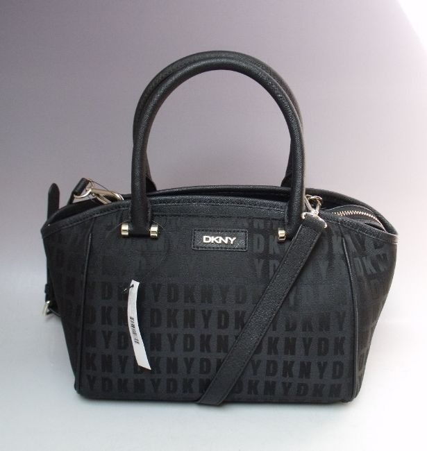A DKNY BLACK FABRIC REPEAT LOGO DESIGN HANDBAG, gold-tone hardware, detachable shoulder strap, W 27 cm, H 27 cm, D 15 cm