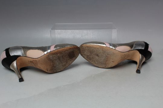 A PAIR OF DOLCE & GABBANA RETRO STYLE COURT SHOES, in metallic silver with pink and black patent trim, EU size 36
