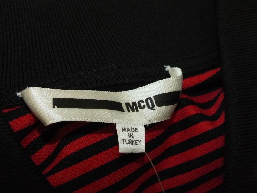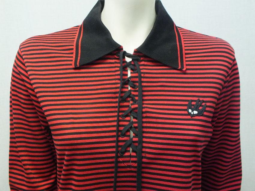 McQ ALEXANDER MCQUEEN, red and black striped dress with lace detail to sides, size small