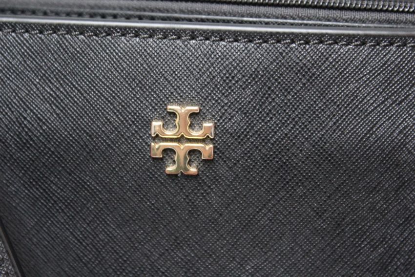 A TORY BURCH BLACK LEATHER TOTE BAG, twin flat lather straps, gold-tone hardware, open topped with central zipped compartment, H 29 cm, W 47 cm S/D