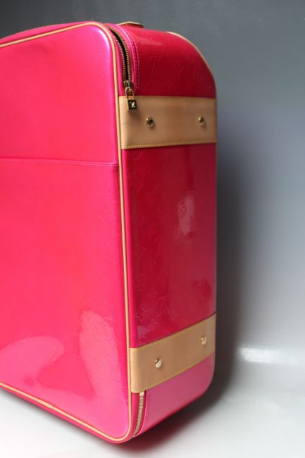 A RARE LOUIS VUITTON PINK VERNIS MONOGRAM SUITCASE, with a leather strap handles and banding, adjustable pull handle, with a pink garment cover and hanger, with a black protective case and dust bag, H 58 cm, W 38 cm, D 21 cm