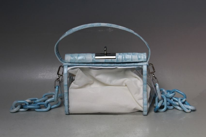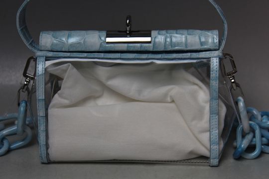 A GU-DE BLUE SNAKESKIN EFFECT AND SEE THROUGH SMALL BAG, with unusual heavy chain effect shoulder strap, dust bag, H 15 cm, W 20 cm