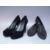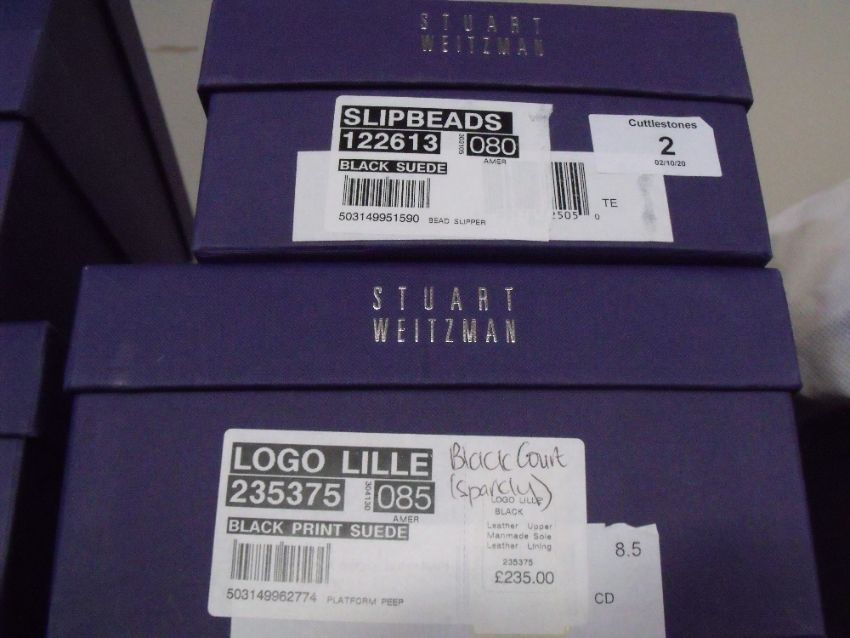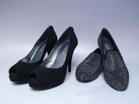 TWO PAIRS OF STUART WEITZMAN FOR RUSSELL BROMLEY SHOES, comprising a pair of black peep toed stiletto platform shoes US size 8.5, and a pair of black beaded slip on shoes US size 8, both boxed