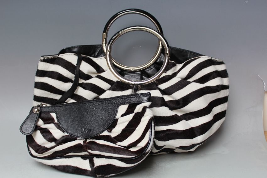 A CHRISTIAN DIOR CALFSKIN ZEBRA EFFECT HAND BAG, with metallic loop hinged handles, with matching accessories/make-up bag, with dust bag, H 24 cm, W 41 cm