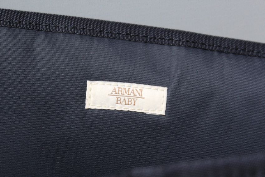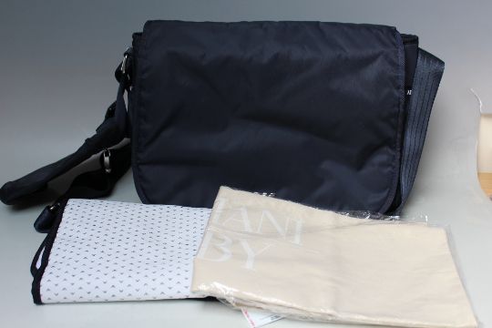 A ARMANI BABY BAG, navy coloured, with changing mat, bottle holder and dust bag, adjustable strap